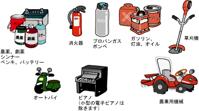 | 爆発の危険や引火性のあるもの、また処理が困難なバイクや農業用機械(草刈機含む)は収集できませんので、販売店等にご相談ください 。 |
